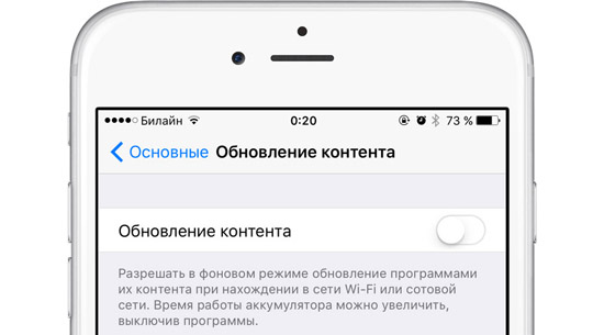 Приложения в iOS 9 умеют подгружать информацию в фоновом режиме. Функция очень полезная, но она расходует заряд батареи и дополнительно нагружает процессорные мощности. Проследуйте в меню Настройки –> Основные –> Обновление контента и отключите использование сервисов в фоновом режиме. Функцию можно отключить полностью или ограничить ее использование для некоторых приложений.