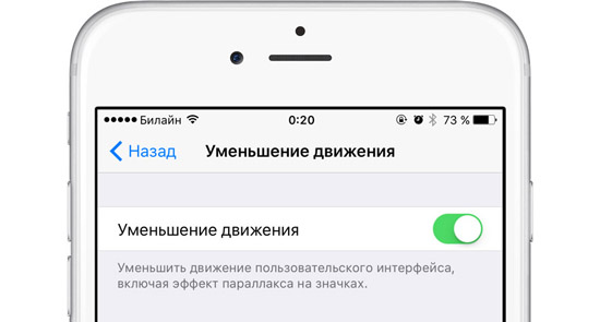 Apple наверняка потратила много времени на создание параллакс-эффекта для обоев, создающих трехмерный эффект. Выглядит все красиво, но кроме пожирания энергии и лишней нагрузки на процессор, эта возможность больше ни на что не годится. Поэтому возвращаемся в меню Настройки –> Основные –> Универсальный доступ, переходим в раздел «Уменьшить движения» и включаем «Уменьшить движение».