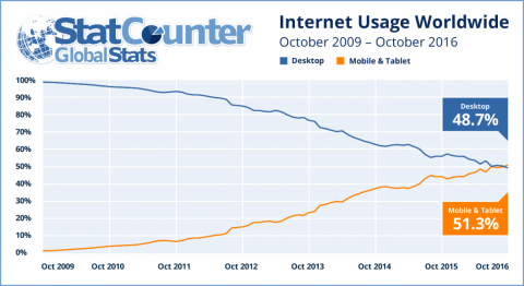 Эту новость сообщила компания StatCounter, которая в октябре насчитала совокупный трафик от смартфонов и планшетов на отметке в 51,3%, тогда как у настольных ПК результат составил 48,7%. Впервые с начала наблюдений в октябре 2009 года они поменялись местами.