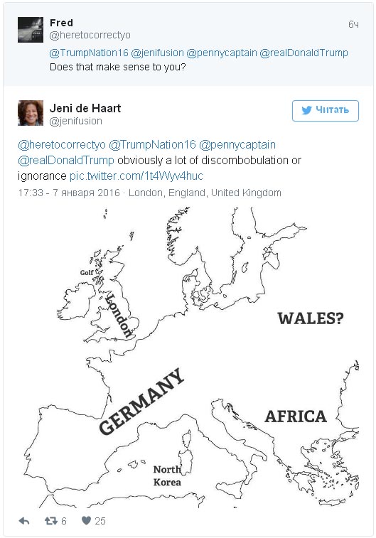 Большинство пользователей расценили запись политика как свидетельство его незнания географии. Один комментарий содержал ссылку на детскую энциклопедию. В другом – приводилась карта мира глазами Трампа, где Африка граничит с Уэльсом.