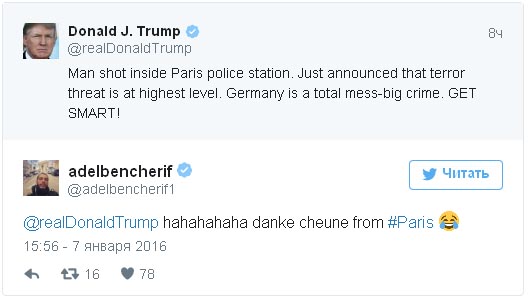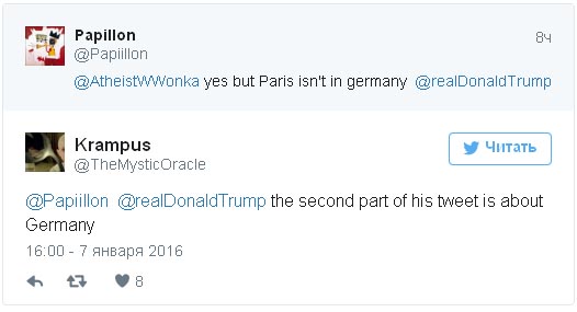 Сообщение в официальном Twitter кандидата в президенты США, миллиардера Дональда Трампа, где он "перенес" Париж в Германию, вызвало шквал комментариев, преимущественно – ироничных.