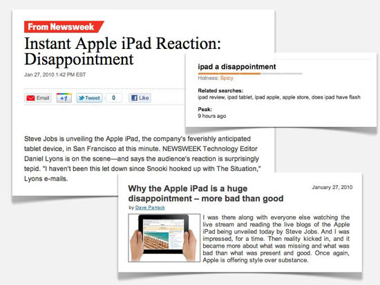 Дэниэл Лайонс из BusinessWeek вспоминал о январской презентации: «Оваций не было, от восторга никто не умер. Я ожидал большего. Это просто большой iPod. Что им делать? Мостить дороги? Я был разочарован». Надо признать, в одном Лайонс был прав: мало кто из присутствующих понял, что они только что увидели. Через несколько часов фраза «iPad разочаровал» стала трендом в Google.