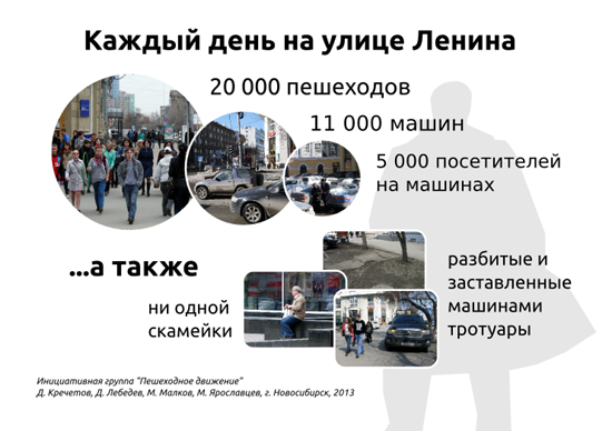 Мы придумали заняться этим подсчётом на форуме. Несколько человек, которые хотели что-то сделать, собрались. Мы никого не звали, чтобы не приходили те, кто хочет почесать языком, а собрались сами, затем нашли добровольцев в помощь и посчитали пешеходное и автомобильное движение на улице Ленина в Новосибирске.