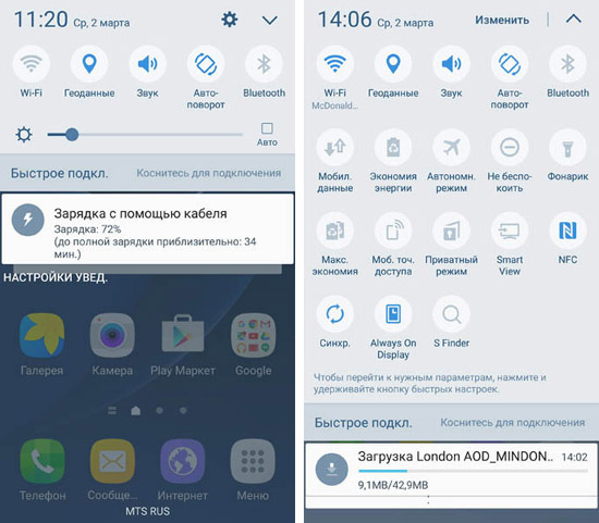 TouchWiz на смартфонах Galaxy предусматривает гибкую настройку кнопок в Центре уведомлений. На Android они появились раньше, чем Пункт управления на iPhone и предлагают больше пространства для кастомизации. К примеру, пользователь может перенести кнопку для запуска Wi-Fi в самый верх, а функцию для включения режима модема убрать вниз за ненадобностью. Вместе с этим, вторым свайпом открывается полный список переключателей.