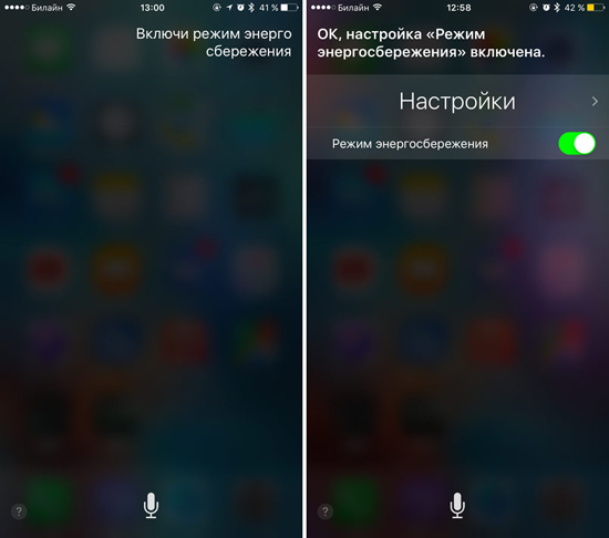 Один из самых быстрых способов активации энергосбережения на iPhone. Вам нужно лишь попросить об этом Siri. Вызовите голосовой ассистент продолжительным нажатием кнопки Home и дайте ему соответствующую команду. Если у вас включена функция «Привет, Siri!», то все еще проще: вызовите помощника голосом и скажите «Включи режим энергосбережения». В этом случае вам даже не придется брать в руки устройство.