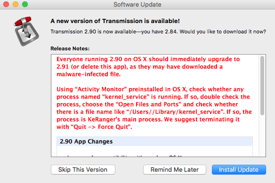 28 февраля этого года вышла версия клиента Transmission за номером 2.90. Каким образом злоумышленникам удалось внедрить в эту сборку установщик «трояна» KeRanger пока неизвестно, так как представители проекта Transmission от комментариев отказываются. Однако факт остается фактом — неделю назад под ударом оказались тысячи Маков.