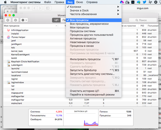 Во-первых, без паники. Во-вторых… Запускаем Мониторинг системы (Activity Monitor) из папки Программы -> Утилиты. Далее, на всякий случай, из меню Вид выбираем отображение Всех процессов…
