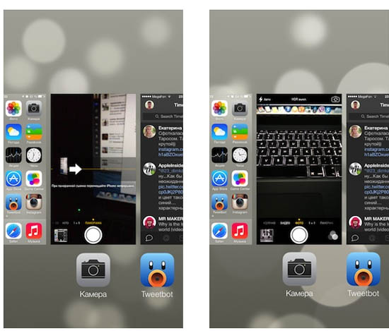 Стоит также заметить, что можно не ограничивать себя простой фотографией. Ничего не помешает таким же методом снять видео или панораму, ориентируясь на уменьшенное отображение приложения «Камера». А вот со сторонними приложениями для фото такой метод работать, увы, не будет, как и не будет работать, если открыть меню многозадачности из любого другого приложения или спрингборда. То есть необходимо, чтобы камера являлась последним запущенным приложением.
