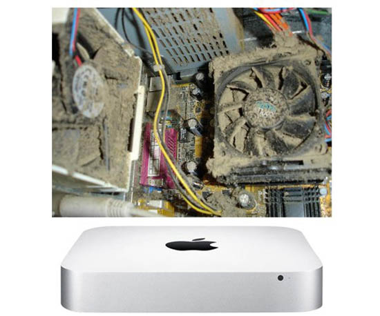 Все это для того, чтобы через месяц после покупки вы могли наблюдать скопища пыли и грязи внутри вашего компьютера. Это равносильно тому, что подсвечивать выгребную яму в деревенском туалете вместо того, чтобы подумать об установке фарфорового унитаза. И массы идут на это. И вместо эстетически красивого, тихого и маленького Mac mini, они покупают стеклянный шумящий гроб, который займет кучу свободного места, будет жрать электричество и собирать пыль. Специалисты компании Apple пошли другим путем и не ошиблись.
