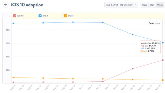 Спустя сутки после релиза доля iOS 10 составляла 14,5%. Через три дня после выхода новая программная платформа Apple достигла 21% среди iPhone, iPad и iPod touch. Такой же долей может похвастаться операционная система Android 6.0 Marshmallow, выпущенная в прошлом году. Статистика адаптации iOS публикуется аналитиками исследовательской компании Mixpanel, Apple пока не озвучила официальные цифры.