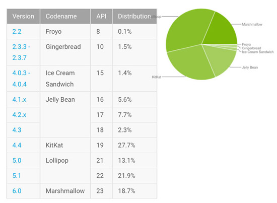 По данным Google доля Android Marshmallow спустя год после анонса составляет около 19%. Лишний раз объяснять, чем это обусловлено, смысла нет. Дифференциация системы является как её преимуществом, так и серьезным недостатком одновременно.