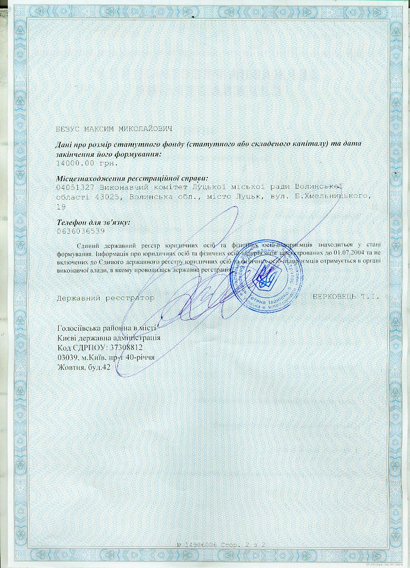 Сегодня уставной фонд фирмы- 14 тыс. грн, а функции руководителя выполняет БЕЗУС Максим Николаевич.