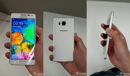 В китайской соцсети Weibo появились новые фотографии Samsung Galaxy Alpha. Судя по снимкам, у смартфона пластиковый корпус, а края либо выполнены из металла, либо стилизованы под отделку благородным материалом. Боковые грани скошены — как у iPhone 5s.