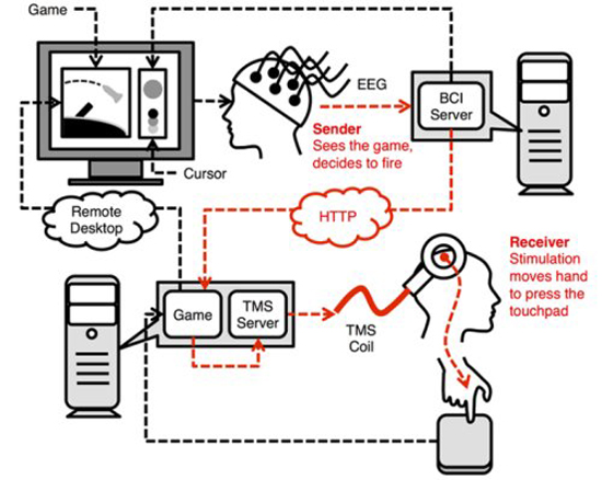 Исследователи из Вашингтонского университета (University of Washington) провели успешную демонстрацию работы компьютерного интерфейса, позволяющего через Интернет передавать сигналы, считываемые из мозга одного человека прямо в мозг другого человека. При этом, несмотря на доли секунды задержки, реализованный учеными интерфейс мозг-компьютер-интернет-компьютер-мозг, позволил одному человеку управлять движениями другого человека. В связи с тем, что данные работы проводятся под эгидой Исследовательского управления армии США (Army Research Office), совершенно неудивительно, что в последней демонстрации использовалась игра-стрелялка и выполнялась имитация действий с взрывными устройствами. Американские военные видят в такой технологии возможность при помощи прямой информационной передачи обойти языковый барьер и различия в опыте между двумя людьми, которым требуется совместными усилиями выполнить некоторую, возможно опасную, работу.