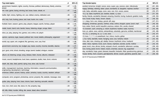 Мужчины чаще женщин говорят о политике, спорте, специфических увлечениях. Зато у женщин в сообщениях гораздо чаще встречаются слова, которые относятся к социальным отношениям и позитивным эмоциям, а также преувеличения.