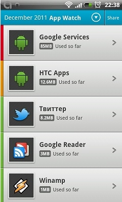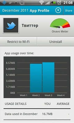 В принципе, тому, кто установит 3G Watchdog, другой программы не понадобится. Но в маркете есть и другие альтернативы, подходящие когда, например, нужно обрезать интернет не для всего смартфона сразу, а только нескольким особо прожорливым программам. Тогда именно Onavo справится с задачей как нельзя лучше: она отслеживает деятельность каждой программы и выводит итоговую статистику. Причем программы, которым запрещено тратить дорогой GPRS/EDGE трафик, не будут навечно заблокированы. Onavo может заставить их использовать только Wi-Fi, что, собственно, и является главным отличием этой утилиты от подобных программ. Программа также заточена под использование мобильного интернета, позволяя указывать особенности тарифного плана для более тщательного контроля.