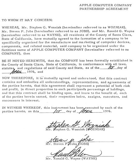 Учредительный договор Apple, за подписями Стива Джобса, Стива Возняка и Рона Уэйна.