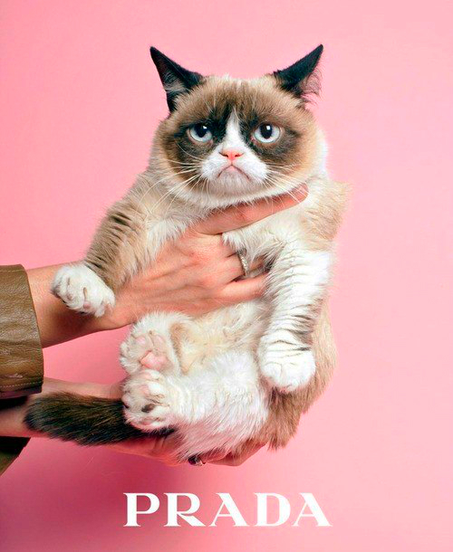 Угрюмый кот, а точнее кошка, по кличке Тард продолжает покорять мир: титул звезды интернета открыл перед животным новые горизонты - журнал AnOther Magazine опубликовал шуточную рекламу Модного дома Prada, лицом которой стала Тард.