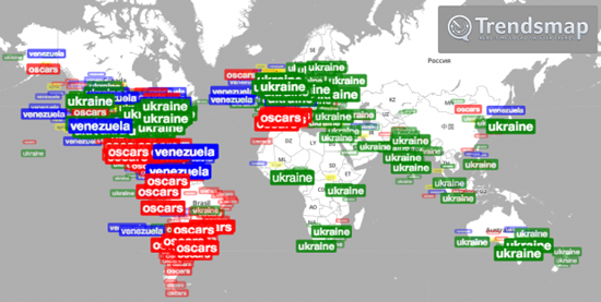 Карта мировых трендов сайта Твиттер указывает, что за последние сутки самыми популярными трендами были слова "Украина", "Оскар", "Венесуэла" и "Сирия". Начало суток отсчитывалось за 2 часа до открытия церемонии вручения награды Оскар.