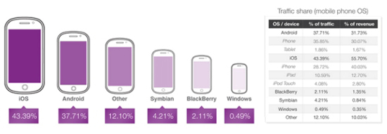 В исследовании также говорится, что объем рекламы на платформе Android превысил аналогичный показатель на iPhone (35,8% против 28,7%), но iOS все еще выигрывает за счет планшетов: