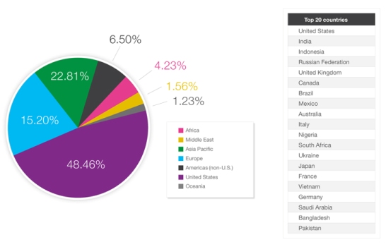 По данным исследования, безусловным лидером по рекламному трафику на мобильных устройствах остается США, хотя за год доля страны в мировом трафике просела с 64% до 48,5%. В целом, за год мировой мобильный трафик увеличился на 52%. Кроме США, основными генераторами такого трафика в мире остаются Европа (15,2%) и Азиатско-Тихоокеанский регион (22,8%). С другой стороны, если считать по доходам от мобильного рекламного трафика, на долю США приходится 70% рынка.