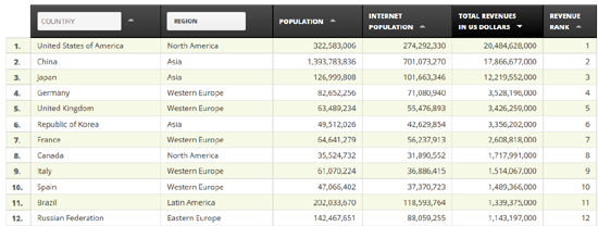 Об этом сообщает компания NewZoo, опубликовавшая международный рейтинг по доходности в индустрии компьютерных игр. Первое место в общем рейтинге занимают США, жители которого потратили на игры $20,4 млрд, второе — Китай ($17,8 млрнд), третье — Япония ($12,2 млрд).