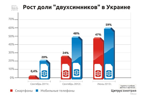 Согласно данным GfK Ukraine, из 406 тыс. мобильных телефонов, проданных в Украине в июне 2013 г., более 59% — это устройства на 2 сим-карты. Следом за ростом «двухсимников» в мобильных телефонах пытается угнаться доля «двухсимников» в смартфонах. Так, новое исследование проекта Цитрусометрия показало, что за последние 8 месяцев продажи смартфонов с двумя sim-картами выросли практически в 2 раза. При этом количество двухкарточных моделей в ТОП-50 самых продаваемых смартфонов в Украине, увеличилось с 5 до 23 моделей.