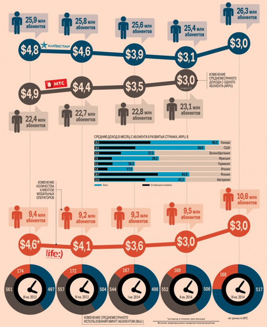 Помимо того, что у мобильных операторов заметно просел доход с каждого клиента, он к тому же еще и унифицировался. «Большая тройка» («Киевстар», МТС, life:)) предоставляет услуги практически по одной и той же цене, в то время как еще год назад «Киевстар» считался немного дороже, чем «МТС Украина», а МТС — дороже, чем life:). Чтобы хоть как‑то увеличить доход, операторы осенью начали предлагать абонентам купить довольно большой объем услуг, «оптовая» стоимость которых оказалась бы несколько ниже, чем в розницу. Так например, «Киевстар» в новом октябрьском тарифе «Свободная страна» предложил сэкономить 33 %, сразу заплатив 90 грн за внутрисетевой безлимит и 200 минут на другие сети. Life:) в это же время вывел линейку «Все включено», где, например, за 79 грн предложил 300 минут на другие сети и сетевой безлимит.