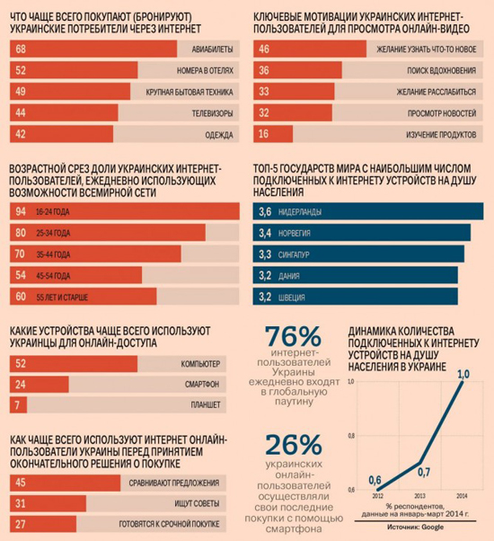 Наиболее популярным устройством среди онлайн-пользователей Украины остается компьютер, который для входа в интернет используют более половины (52 %) сограждан. Чаще всего украинские потребители с помощью всемирной паутины приобретают авиабилеты (68 % респондентов), бронируют номера в отелях (52 %) и покупают крупную бытовую технику (49 %). Интересно, что в 26 % случаев соотечественники осуществили свою последнюю покупку с помощью смартфона. Итоги исследования в очередной раз подчеркивают важность интернета в процессе принятия окончательного решения о покупке: 45 % украинских юзеров при помощи всемирной паутины перед приобретением товара обязательно сравнивают все предложения рынка, а 31 % ищут полезные потребительские советы.
