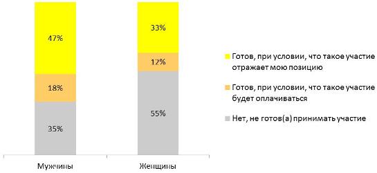 Намерения сильной и прекрасной половин относительно участия в акциях значимо отличаются. Так, свою готовность участвовать в акциях в целом подтвердило 65% мужчин и только 45% женщин. Статистически значимо больше мужчин готовы участвовать в акциях, как из-за своих убеждений, так и за вознаграждение.