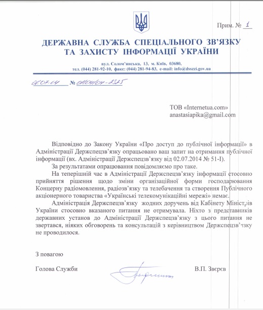В связи с этим мы отправили официальные запросы в государственные органы. У СБУ мы поинтересовались, кто и когда из их представителей согласовывал проект о создании национального телеком-оператора. Однако они перенаправили наш запрос в Госспецсвязи. А те - назад в СБУ.