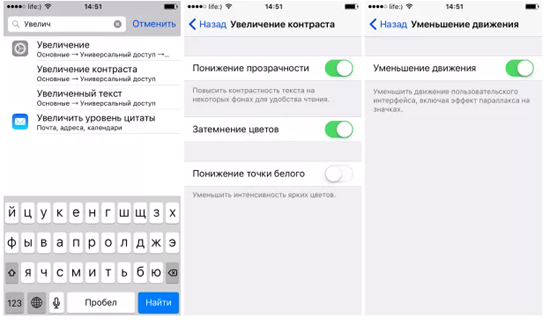 Итак, в поиске настроек находим раздел «Увеличения контраста» и переводим ползунок «Понижение прозрачности» во включенное положение. Возвращаемся на шаг назад и в разделе «Уменьшение движения» включаем одноименный переключатель.