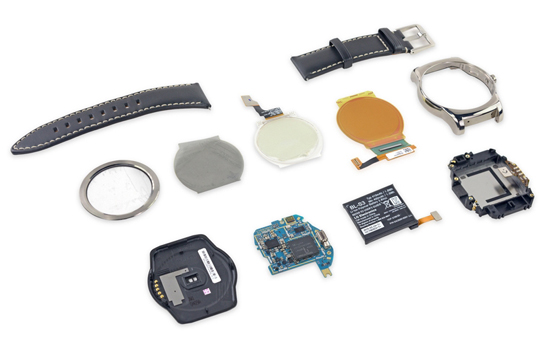Вскрытие, проделанное специалистами iFixit, показало, что в часах применены модуль ОЗУ SK Hynix H9TU32A4GDMC 512 MB Mobile DDR2, контроллер сенсорного экрана Synaptics S3526B, комбинированный чип акселерометра/гироскопа Invensense M651, электронный компас Asahi Kasei AK8963, аудиокодек Qualcomm WCD9302 и аккумуляторная батарея ёмкостью 410 мА·ч.