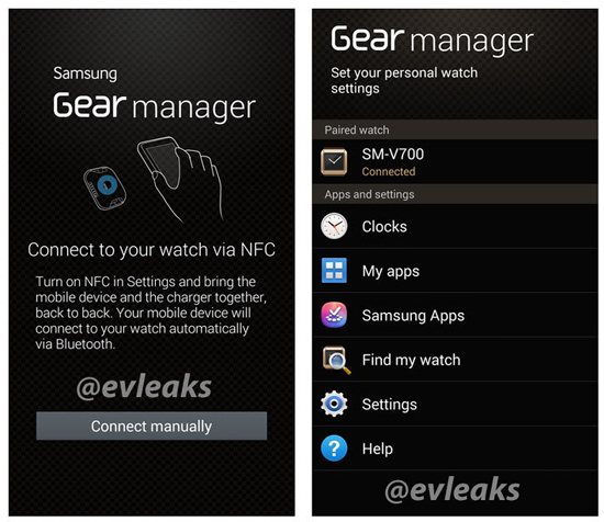 Пользователь Twitter под псевдонимом @evleaks опубликовал несколько скриншотов приложения для работы с умными часами Samsung Galaxy Gear, официальный анонс которых состоится на будущей неделе. Из полученных изображений можно сделать вывод, что подключить гаджет к смартфону можно будет как вручную, так и с помощью NFC.