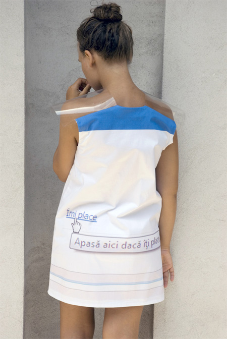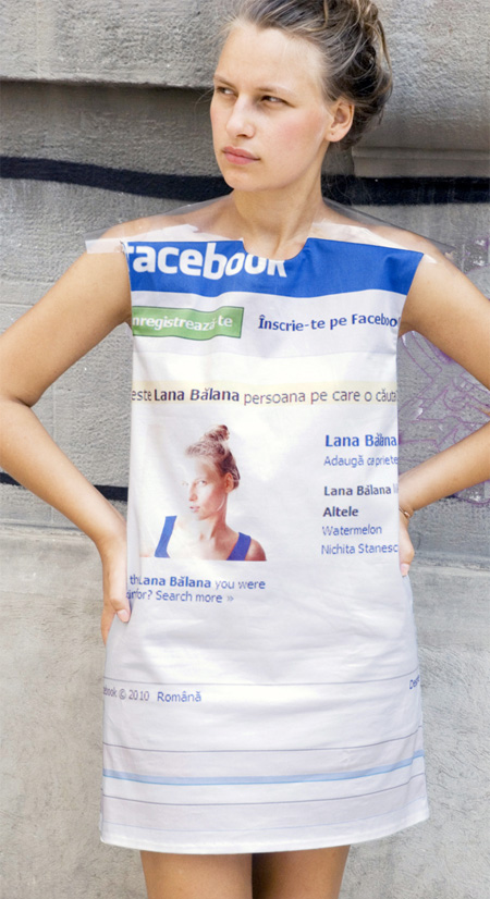 Креативное платье, созданное румынским дизайнером Ланой Думитру, выглядит как страница Facebook с анкетными данными.