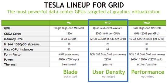 Корпорация NVIDIA развивает инфраструктуру GRID — комплекса облачных технологических решений для обеспечения высокой плотности пользователей и ускорения работы виртуальных десктопов. Последним большим анонсом, связанным с расширением аппаратных возможностей GRID, стало сообщение калифорнийской компании о предстоящем выпуске в августе текущего года графического процессора Tesla M10 и одноимённого ускорителя на его основе.