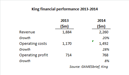 Что касается King, создателя популярной игры Candy Crash Saga, то его доход за 2014 год составил 2,3 миллиарда долларов. Рост по сравнению с предыдущим периодом составил более 20%, а чистая прибыль выросла на 8% (с 714 до 768 миллионов долларов). На маркетинг King потратила 455 миллионов долларов (на 20% больше, чем в прошлом году).
