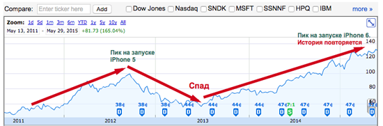«Весь прошлый годы мы усиленно размышляли, что же ждет нас после выхода на рынок iPhone 6. На данный момент в прогнозах по Apple мы используем следующие показатели роста: 28% на июнь 2015 года, 11% к сентябрю и всего 1% к декабрю 2015 года. На 2016 год мы закладываем всего 2% роста прибыли. Надеемся, что увеличение Apple доли рынка положительно скомпенсируют темпы роста, но все равно ожидаем замедления. Все помнят, что произошло после подъема при запуске iPhone 5 в 2013 года – акции упали на 44% всего через 7 месяцев после запуска нового устройства. Тем не менее люди продолжают покупать акции Apple и за последние 4 месяца их стоимость выросла на 22%.»