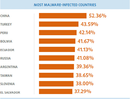По информации PandaLabs, зловреды проникли на каждый третий телефон. По этому показателю лидирует Китай, где вредоносное программное обеспечение установлено более чем на половине устройств (52,36%).