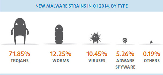 Антивирусная компания PandaLabs опубликовала отчёт за I кв. 2014 г по количеству новых вирусов. Цифры поражают воображение: за три месяца зарегистрировано более 15 миллионов образцов новых зловредов, то есть каждый день создаётся около 16 000 штук!