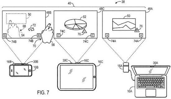 В патенте описывается изобретение, которое называется «Общие рабочие пространства на проецируемом дисплее», рассматривается технология, предполагающая интеграцию в iOS-устройства компактных проекторов. Это позволит пользователям демонстрировать друг другу визуальную информацию со своих гаджетов и управлять презентациями при помощи жестов.