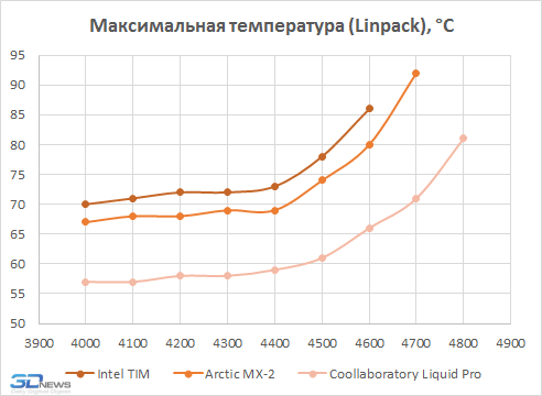 А как показал наш эксперимент со скальпированием Core i7-6700K, замена NGPTIM на жидкий металл позволила отодвинуть верхнюю границу разгона на 200‒300 МГц, с обычных 4,5‒4,6 до 4,8 ГГц, причём процессор при этом работал в благоприятном тепловом режиме. Что касается этого самого теплового режима, то если ранее под нагрузкой процессор при номинальной частоте нагревался до 70 градусов, то с жидким металлом температура упала до 57 градусов. 13 градусов выигрыша простой заменой термоинтерфейса, а ведь это даже не припой.