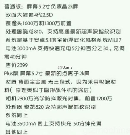 Согласно полученной информации, Xiaomi к запуску готовит две флагманские модели - Mi5 и Mi5 Plus. Стандартная модель Xiaomi Mi5 будет оснащена 5,2-дюймовым 2K дисплеем и построена на базе 8-ядерного процессора Snapdragon 810, как Oneplus 2, а не на новейшем Snapdragon 820, как ранее предполагалось. Особенностью этого чипа станет поддержка новой технологии Qualcomm Snapdragon Sense ID 3D, которая должна существенно повысить качество работы сканера отпечатков пальцев. В целом, все известные сейчас характеристики Xiaomi Mi5 выглядят следующим образом: