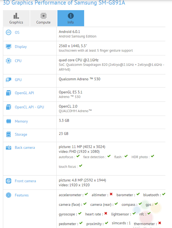 В таблице сказано, что защищенный флагманский смартфон от Samsung получит 5.5-дюймовый экран с Quad HD-разрешением (2560x1440 пикселей), четырехъядерный процессор Snapdragon 820, 4 ГБ оперативной памяти и 32 ГБ постоянной. Здесь также отмечено, что телефон оснастят 12-мегапиксельной основной камерой и 5-мегапиксельной фронтальной. Работать он будет на Android 6.0.1 Marshmallow.