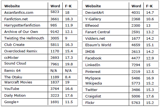 Исследователи проанализировали пользовательские соглашения на 30 популярных интернет-сайтах, которые помогают пользователям делиться своим контентом. Среди изученных ресурсов были Wikipedia, LinkedIn, Pinterest, YouTube, Flickr, IMDB, Facebook, Twitter, Google Plus, а также популярные среди англоязычных читателей Remix64 и Fanfiction.net.
