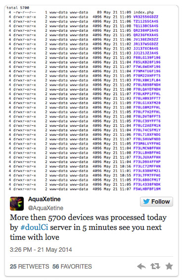 Как пишет ValueWalk, хакеры искали «дыру» безопасности, позволяющую дистанционно снимать блокировку с iPhone и iPad, около пяти месяцев. По словам корреспондентов издания, им удалось вычислить Twitter-аккаунт, имеющий отношение к Doulci. Сообщение в этом микроблоге свидетельствуют, что голландцы разблокируют по своей методике больше 5 700 смартфонов и планшетов Apple за пять минут.