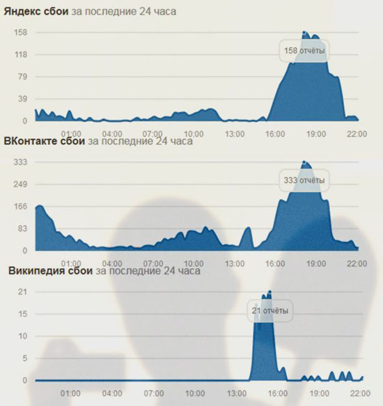 По статистике сервиса «Каждый сбой», с 13:00 до 22:00 4 июня часть пользователей не могла попасть на такие сайты, как Яндекс, ВКонтакте, Википедию, «Одноклассники» и другие ресурсы.