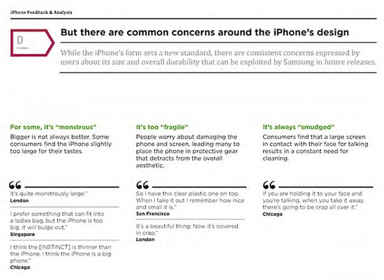 В документах также были приведены несколько цитат пользователей, не слишком довольных работой с iPhone. Большинство из них были связаны с 3,5-дюймовым экраном смартфона. Сегодня он кажется слишком маленьким, но в то время все было иначе. Так, пользователь из Лондона назвал эту модель iPhone «чудовищно большой», а девушка из Сингапура заявила, что отдала бы предпочтение чему-то, способному поместиться в дамскую сумочку. Некоторые пользователи утверждали, что смартфон слишком хрупкий и его легко повредить.
