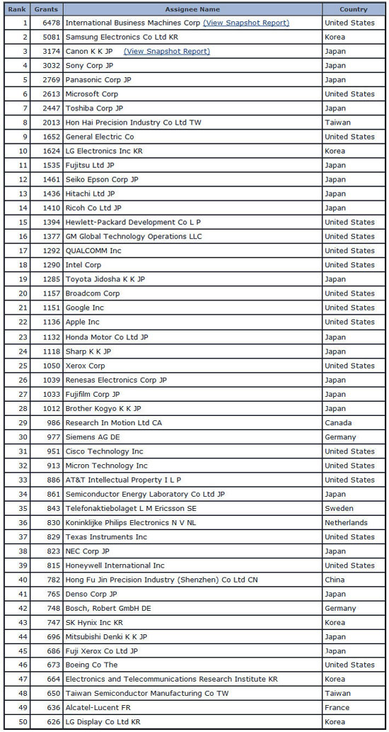 Компания Apple получила в 2012 году 1136 патентов, поднявшись с 39 позиции на 22 среди компаний, регистрирующих наибольшее количество технологий и решений. Лидерство сохраняет IBM (6478 патентов), на втором месте — Samsung Electronics (5081), Canon (3174) на третьей позиции, на четвертой — Sony (3032), замыкает топ-5 Panasonic с 2769 патентами.