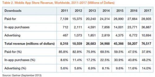 Gartner сообщает, что доход от мобильного ПО в 2013 составит $26 млрд. 17% (более $4 млрд) из этих $26 млрд - покупки внутри бесплатных программ и игр. В будущем доход от мобильных приложений будет расти быстрее, чем количество скачиваний. Из 102 млрд программ, скачанных за 2013 год, 83 млрд - бесплатные (около 91%). На протяжении ближайших четырех лет внутриигровые покупки в общем доходе займут долю около 48%. К 2017 еже годно будут скачиваться около 268 млрд программ.
